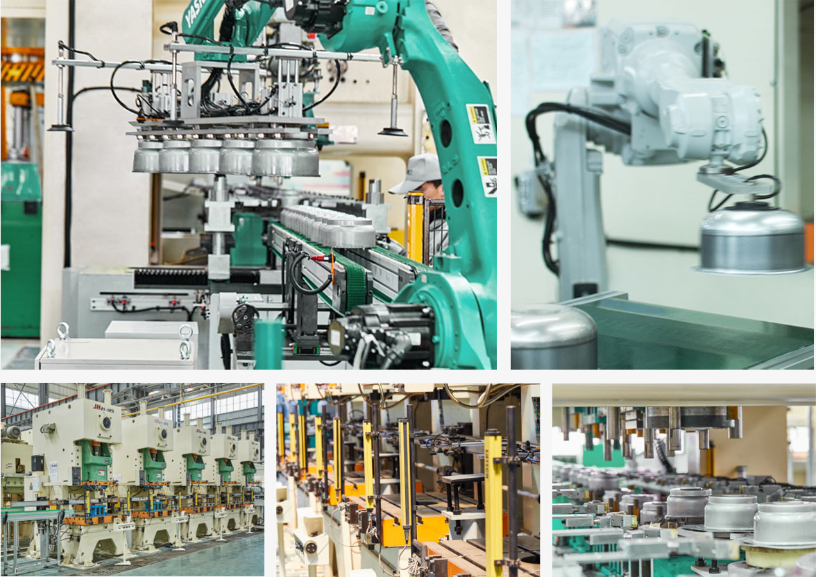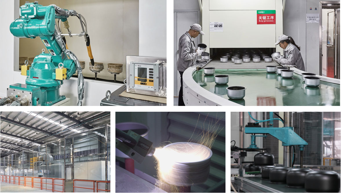 備有各類生產(chǎn)加工設(shè)備近300臺,實現(xiàn)了MES智能派工、開工、完工匯報,SOP實時在線監(jiān)控設(shè)備、物料、品質(zhì)狀態(tài)。配置有:全自動鍋蓋生產(chǎn)線(采用機器人、機械手和自動砂光機組成),全自動內(nèi)鍋生產(chǎn)線(采用機器人和機械手組成),全自動外鍋生產(chǎn)線(采用多軸三次元加工設(shè)備),同時還配備有大量單點開式?jīng)_床、大型龍門沖床和四柱六缸油壓機,可以靈活機動組成各種生產(chǎn)線。